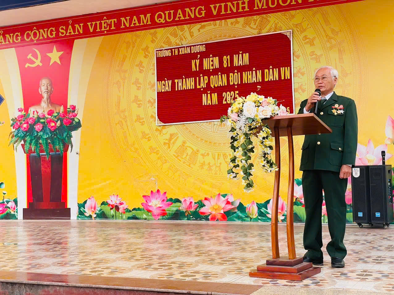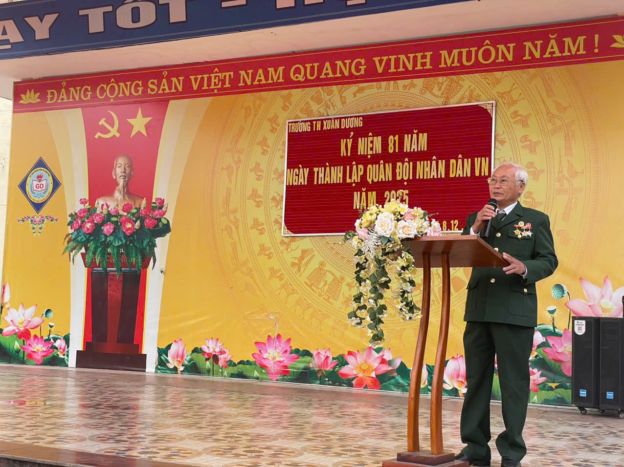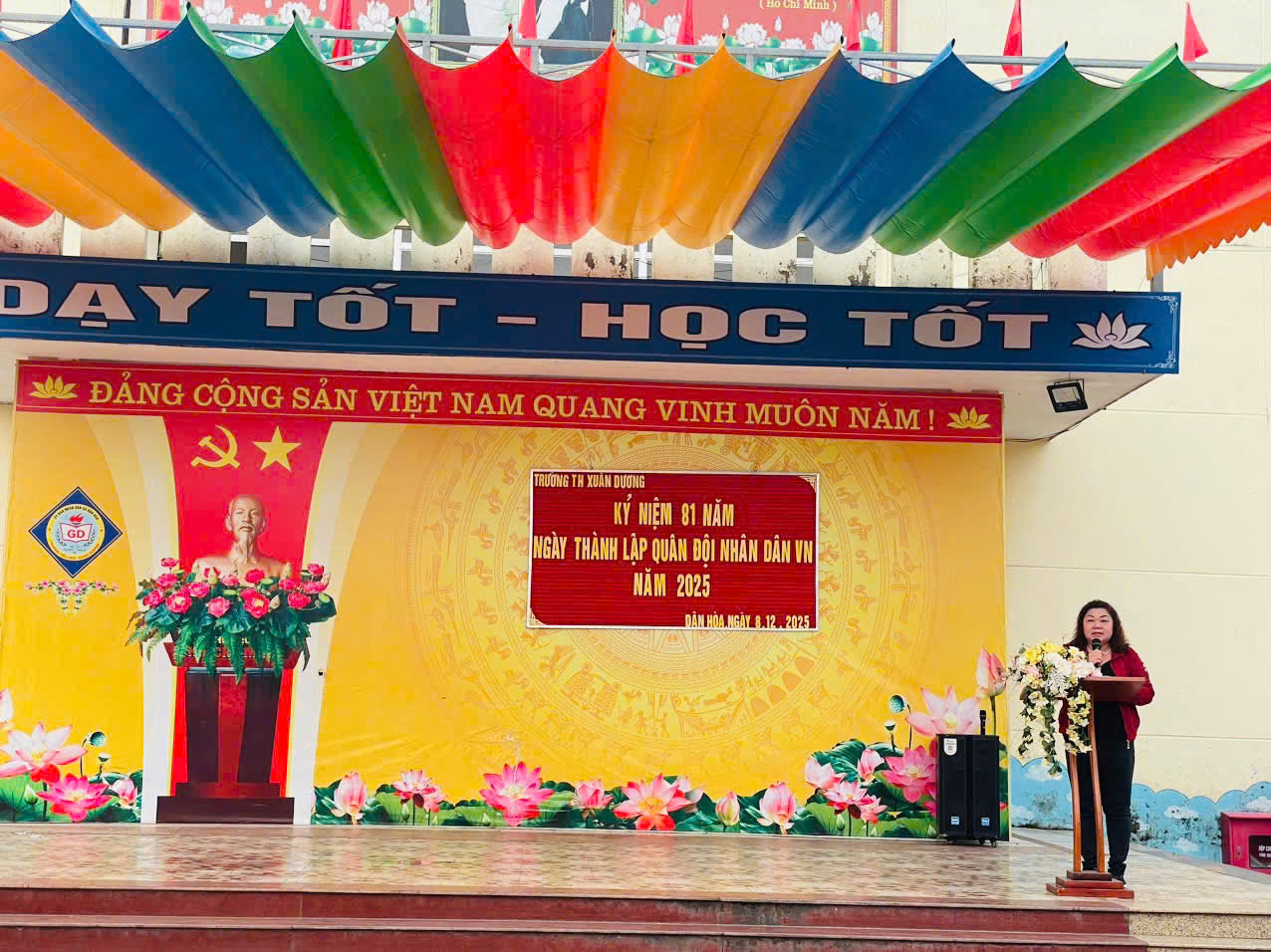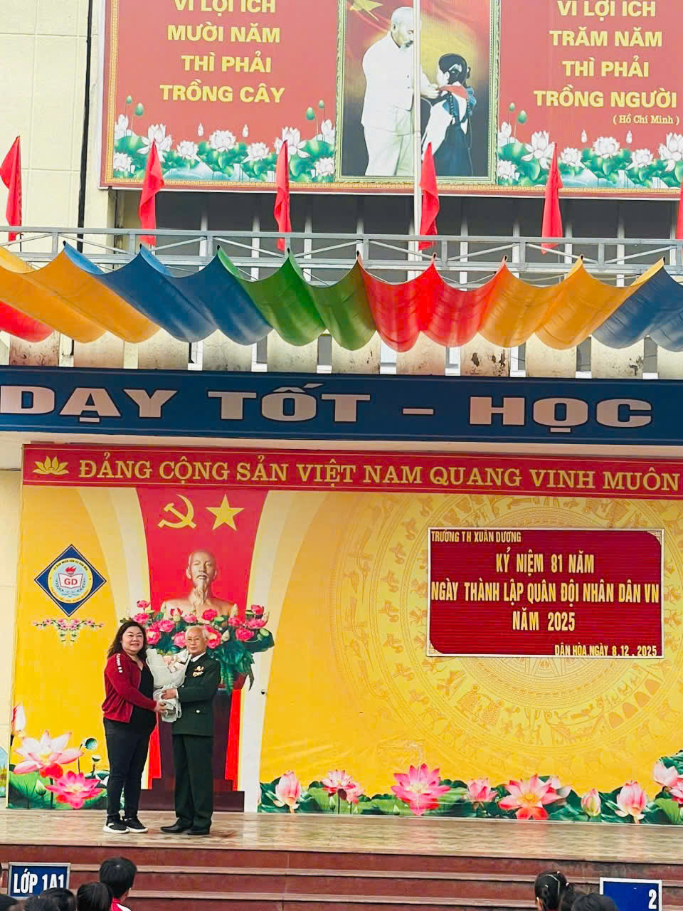 Bên cạnh giúp các thầy cô và các em học sinh hiểu rõ hơn về những trang sử hào hùng của dân tộc; Hôm nay ngày 08/12/2025 trường TH Xuân Dương phối hợp cùng Hội CCB xã Dân Hoà tổ chức buổi Sinh hoạt dưới cờ với chương trình “Giáo dục truyền thống” hướng tới kỷ niệm 81 năm thành lập Quân đội nhân dân Việt Nam (22/12/1944 - 22/12/2025) và 36 năm Ngày hội Quốc phòng toàn dân (22/12/1989 - 22/12/2025). Chương trình không chỉ giúp các em học sinh bồi đắp tình yêu quê hương, đất nước mà còn là dịp để chúng ta tri ân những thế hệ cha anh đã ngã xuống vì hòa bình. Giúp các em hiểu rõ hơn về những trang sử vẻ vang, hun đúc thêm tinh thần yêu nước, lòng tự hào dân tộc và ý thức trách nhiệm của thế hệ trẻ với quê hương, đất nước hôm nay.